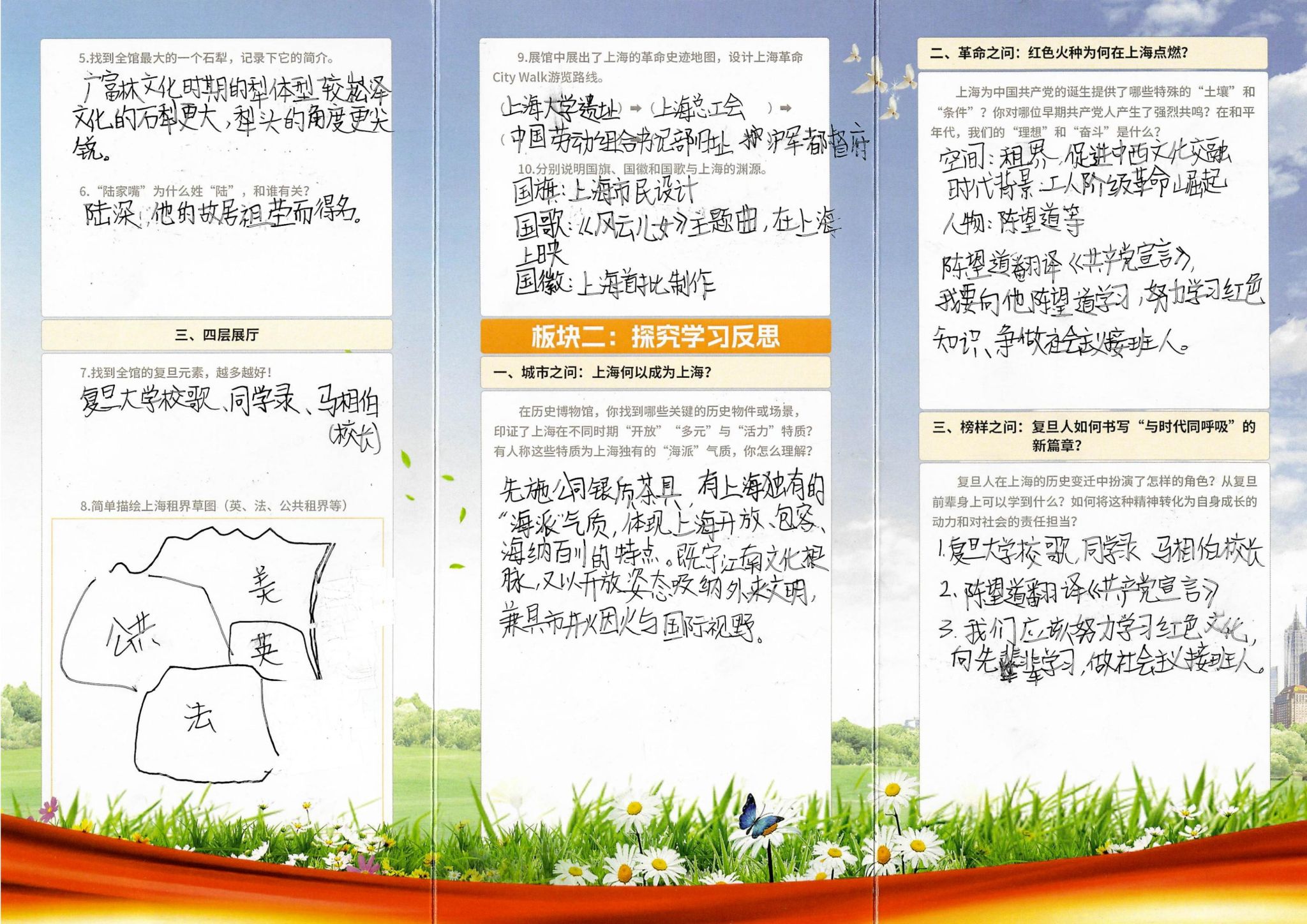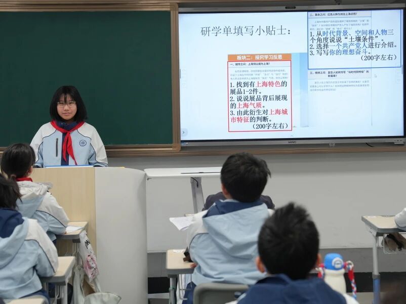 参观结束后,同学们提交研学单并分享感悟。原辰同学表示:“从上海先民的生活方式到近代革命的壮阔历程,我真切体会到上海精神的内涵,作为新时代少先队员,我要为城市发展添砖加瓦。”王天凡同学则收获了满满的自豪感:“这场研学让我读懂了家乡的历史与时代背景,身为上海学子的骄傲油然而生。”强薇同学对汇丰铜狮、百子大礼轿印象深刻,更感慨道:“我读懂了中国共产党成立的不易与上海人民抗战的艰辛,这场研学受益匪浅。”