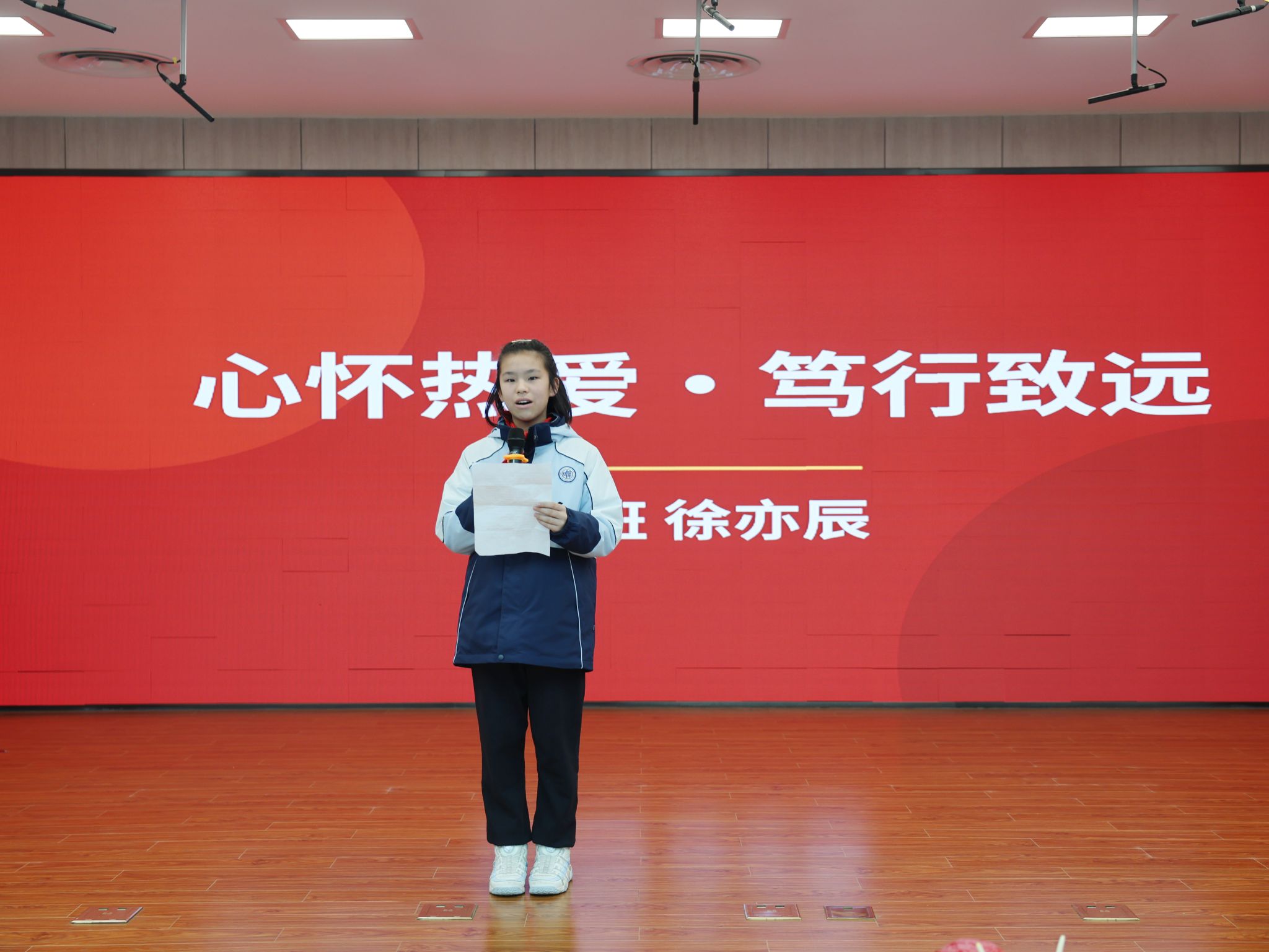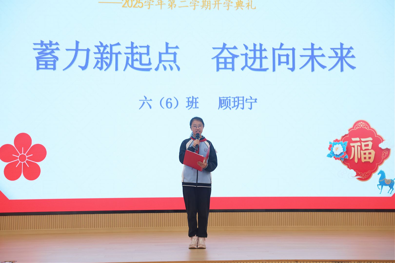 现场分享环节,七年级学生代表畅谈寒假期间在学习与实践中的所思所悟,将自己的收获与感悟传递给每一位同学;六年级学生代表立下新学期成长目标,更向全体同学发出勤学善思、笃行不怠的奋进倡议,少年之声铿锵有力,尽显青春朝气;六年级学长徐亦辰同学还带来了真挚温暖的新学期寄语,为学弟学妹们送上成长的祝福与奋进的鼓励。