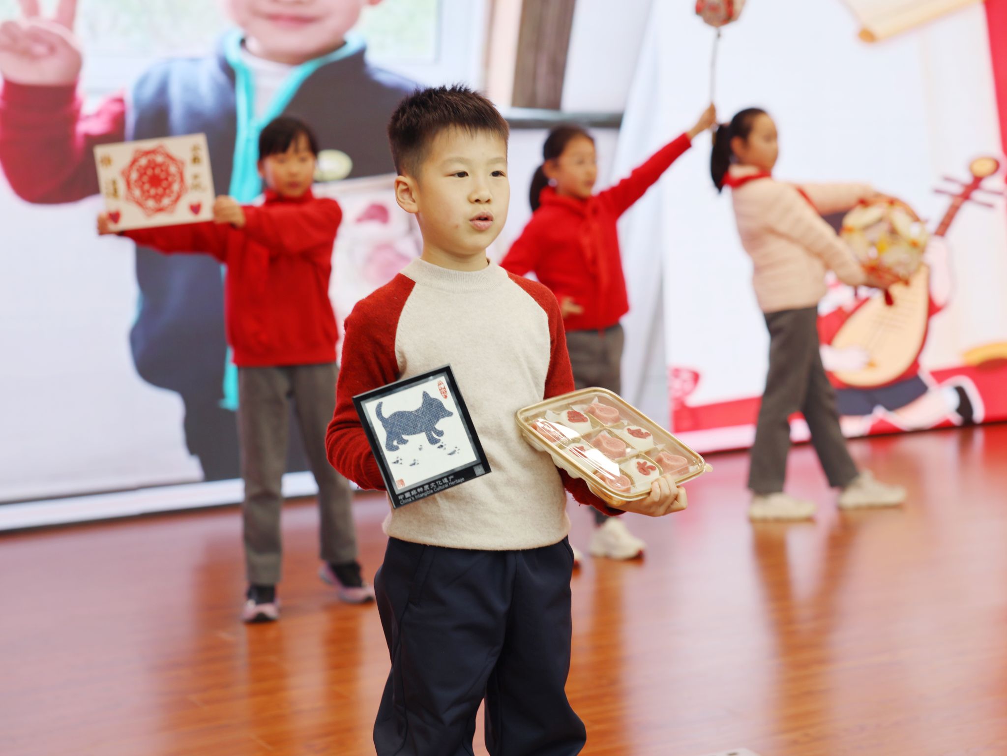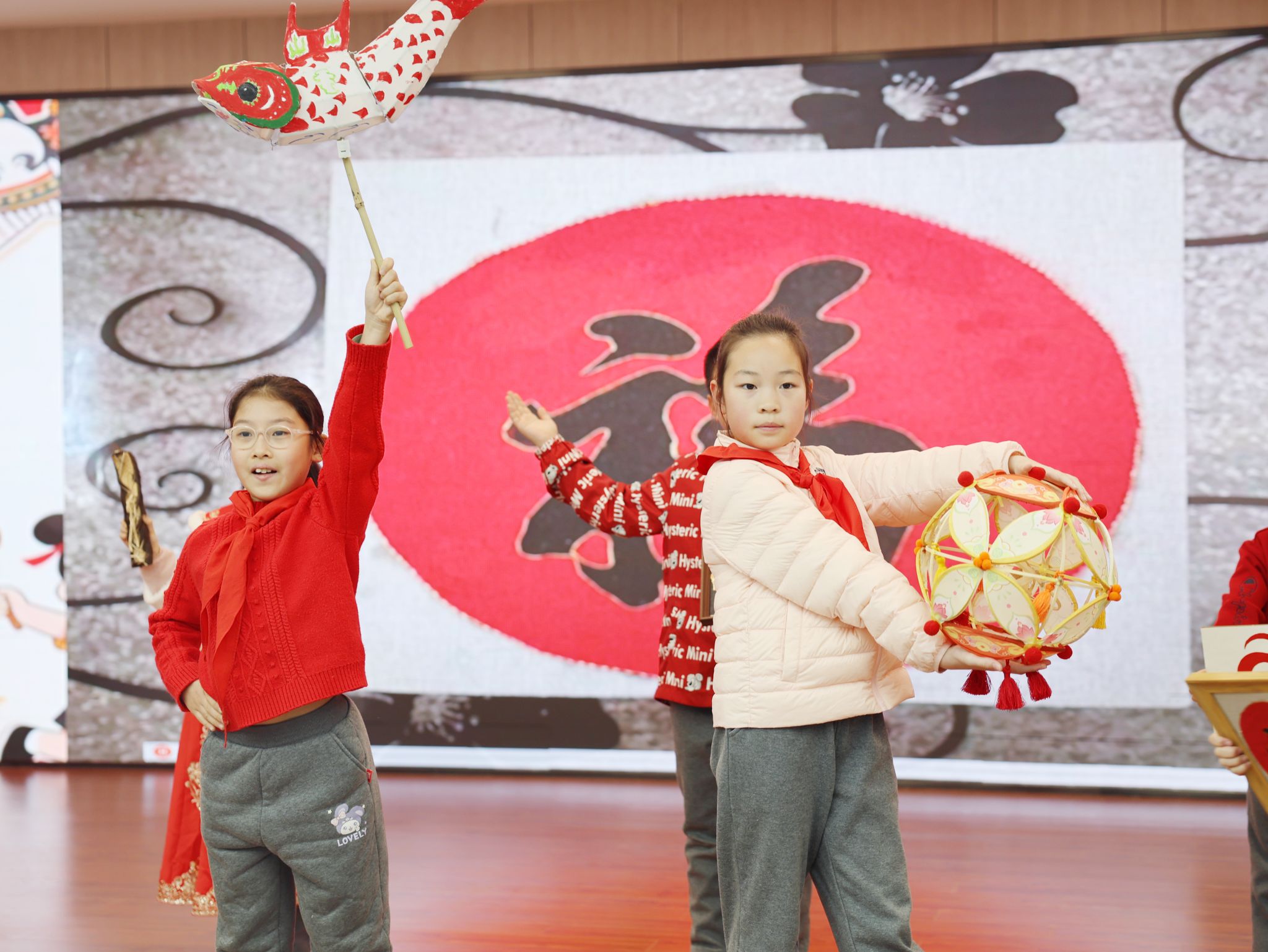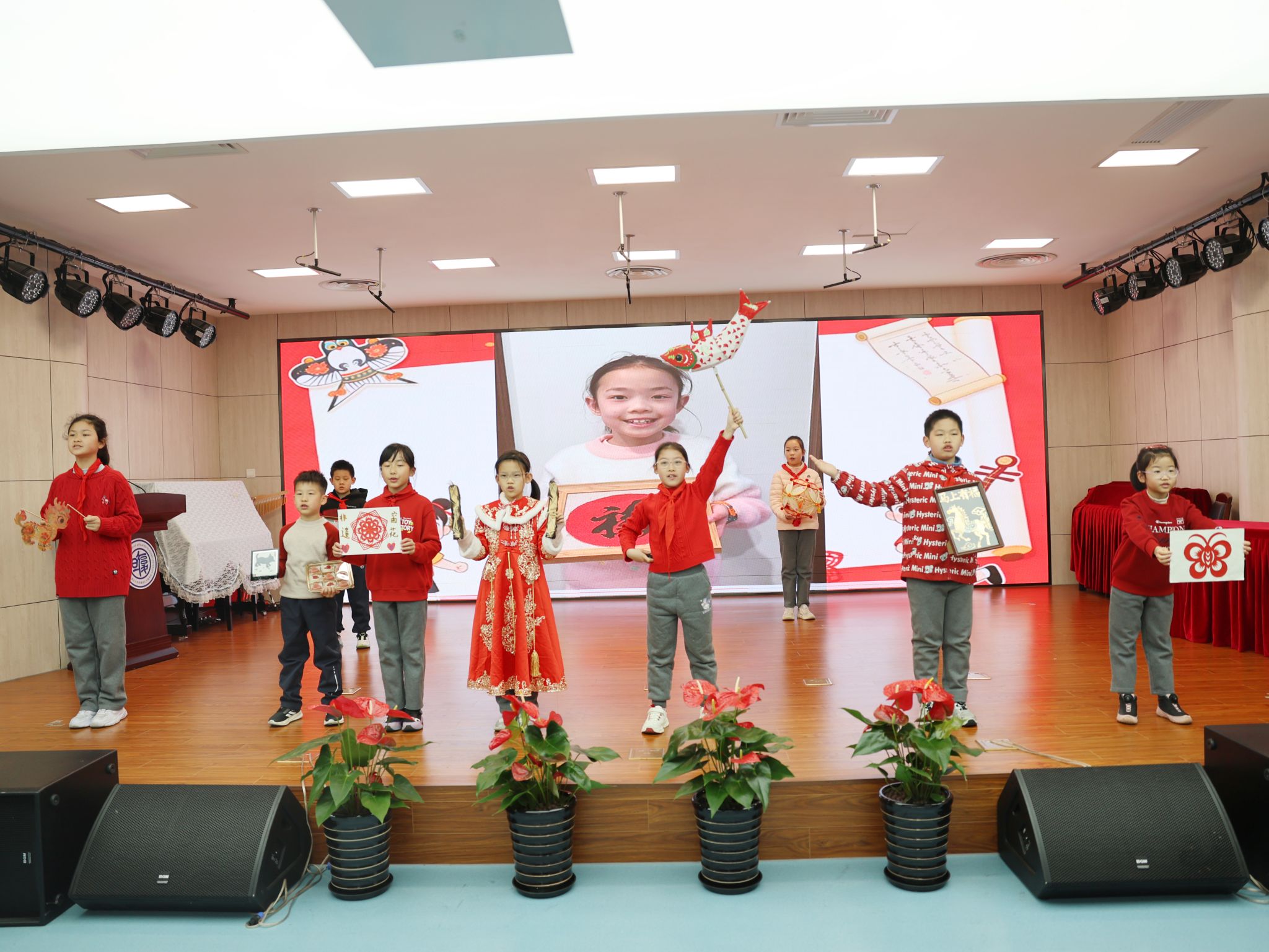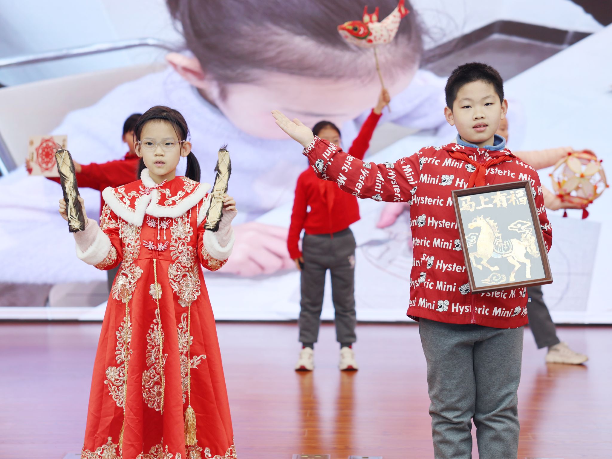传统文化与红色教育相融,厚植学子家国情怀。学校精心编排的特色节目《非遗小达人·筑梦向未来》温情上演,12名小达人手持鱼灯、剪纸、烧箔画等亲手制作的非遗作品,以快板表演搭配情景分享的形式,生动讲述寒假非遗寻访的经历与收获,让全体师生在沉浸式体验中感受中华传统文化的独特魅力。