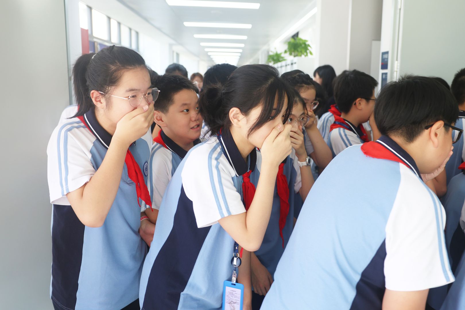 任课教师立即停止课堂教学,沉稳指挥同学们放下手中物品;班主任迅速抵达班级门口,接力引导疏散。学生们排成两路纵队,弯腰低姿前行。撤离过程中,同学们展现出良好的秩序,不拥挤、不推搡;两个年级相遇时,高年级学生主动礼让低年级同学先行,彰显文明与担当。