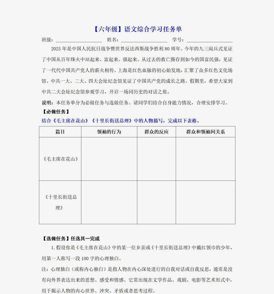 为深化国庆主题教育成效,初中部同步设计国庆综合实践作业:小记者社团围绕迎国庆活动开展采访报道,记录台前幕后的故事;语文、道法等学科设计的综合实践作业融合中共二大纪念馆研学内容,通过撰写布展词、分析红色经典课文等形式,引导学生在实践中感悟家国情怀,全面提升观察表达、文化传承等核心素养。