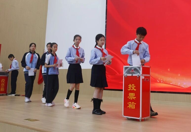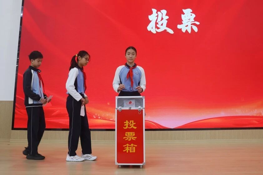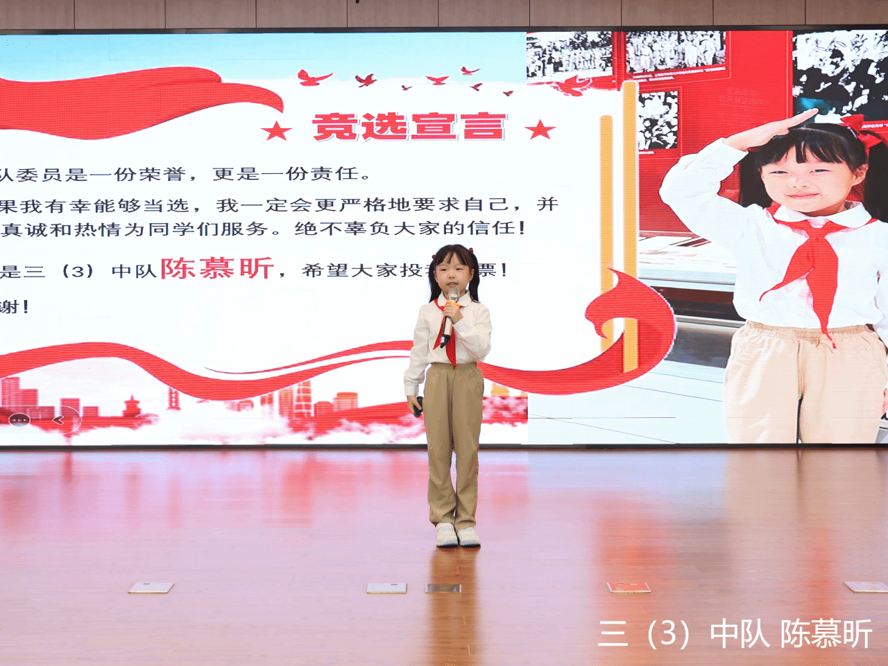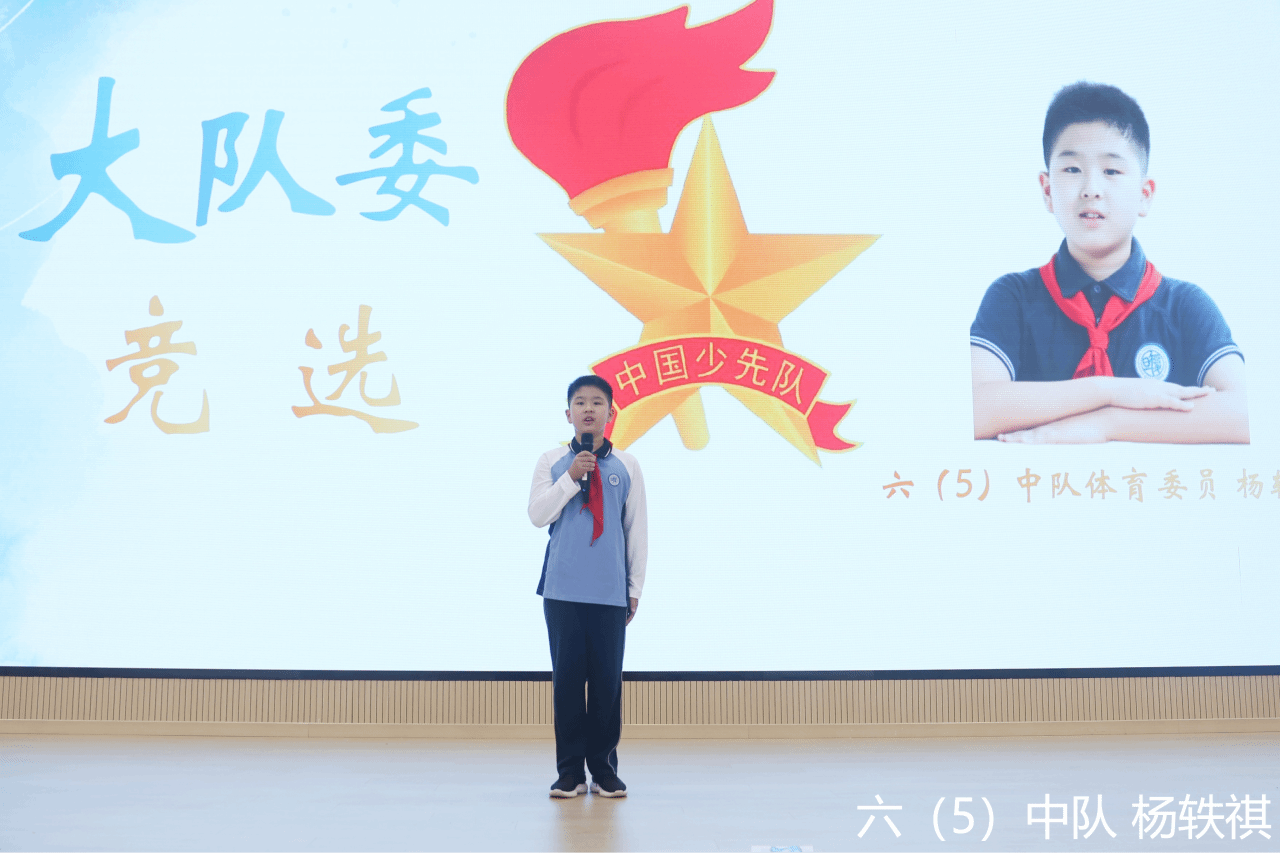 在新一届大队委员会改选环节,各候选人上台演讲,分享了自己争做新时代好少年的实践成果和感受。