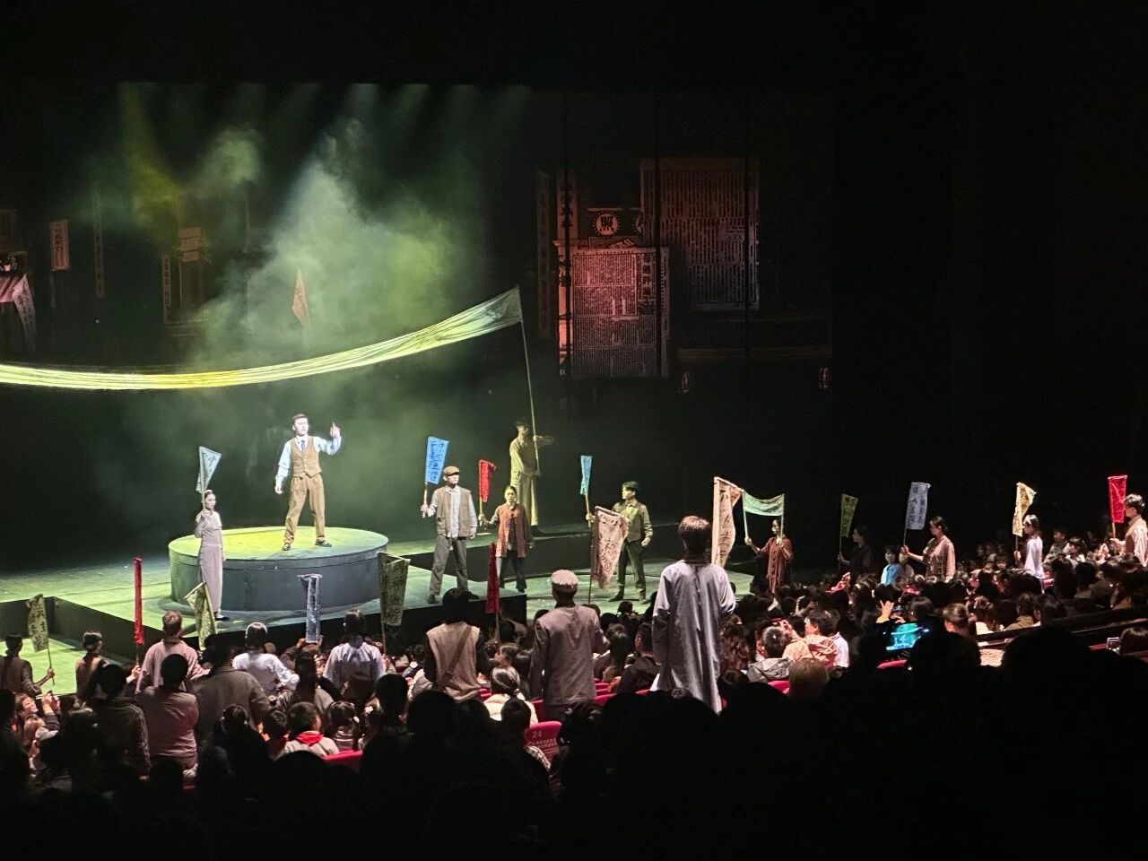 从《申沪溯源》的远古回声,到《沪上传奇》的民国风情,再到《觉醒年代》的革命烽火与《风从海上来》的现代繁华……舞台之上,声光电水等高科技手段与演员们精湛的表演完美融合。可移动的舞台、从天而降的演员、瞬间转换的场景,无不引来同学们的阵阵惊呼与热烈掌声。