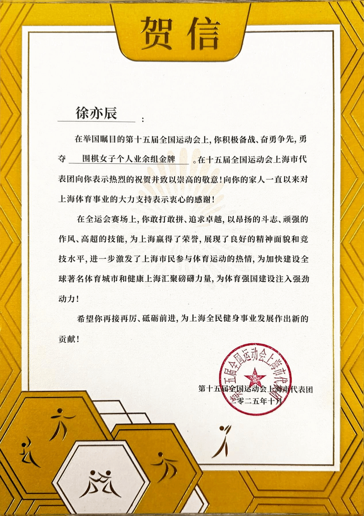 赛事捷报传来,上海市代表团、徐汇区体育局及教育局相继发来贺电。贺电盛赞徐亦辰同学“敢打敢拼、追求卓越,以昂扬斗志、顽强作风与高超技能为上海争光”,并勉励她“再接再厉、砥砺前行,为上海全民健身事业发展续写新篇”。