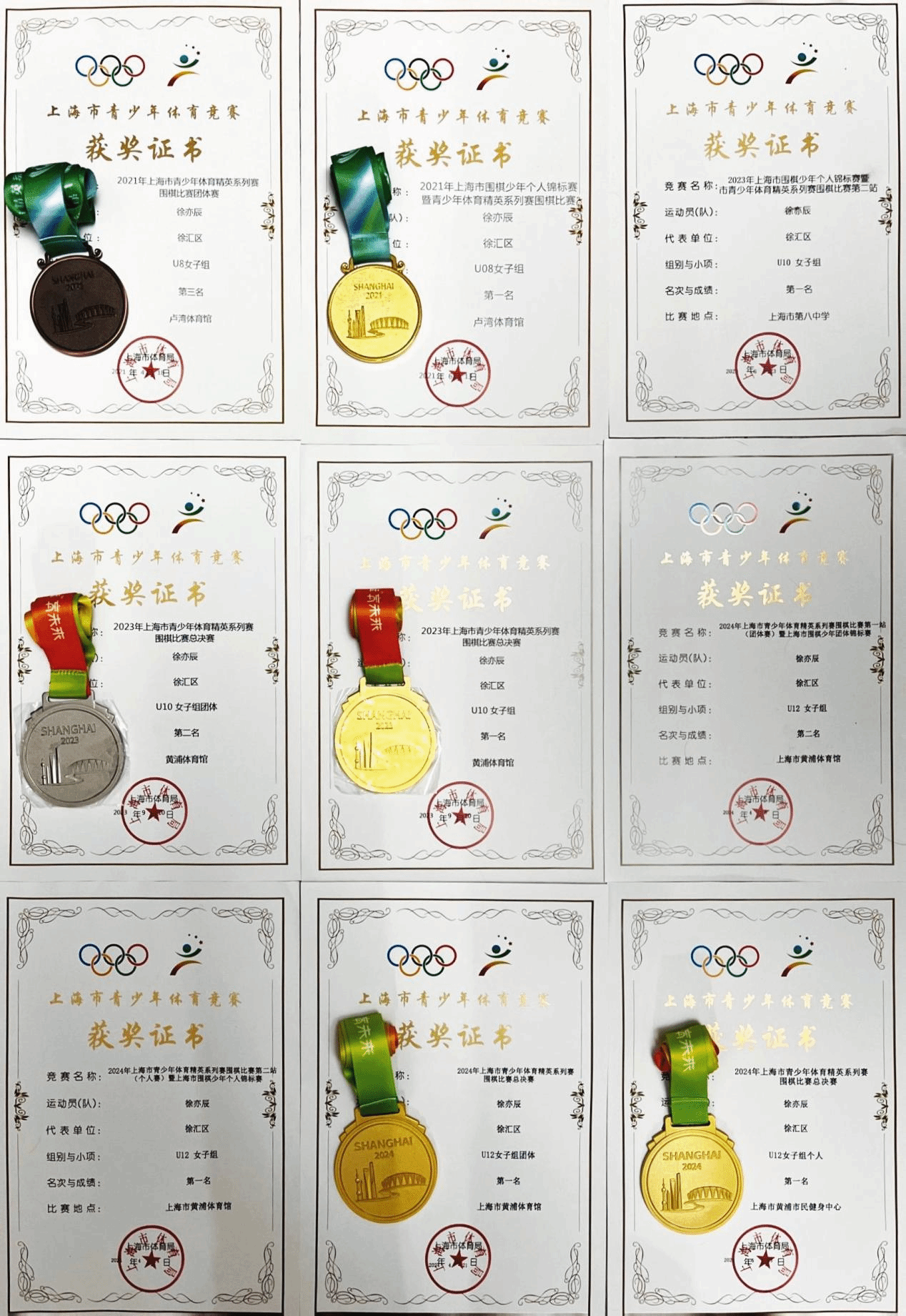 徐亦辰同学自幼与围棋结下不解之缘,多年来始终坚持系统训练,一步一个脚印扎实精进,在各级各类赛事中屡创佳绩。近年来,她不仅包揽上海市青少年体育精英系列赛、中小学生围棋锦标赛、学生智力运动会等多项市级重要赛事冠军,更在“昊越杯”“黄山杯”“育苗杯”等全国少儿围棋公开赛中表现亮眼,凭借稳定发挥斩获多项全国冠军,充分展现出过人的围棋天赋与扎实的竞技功底。