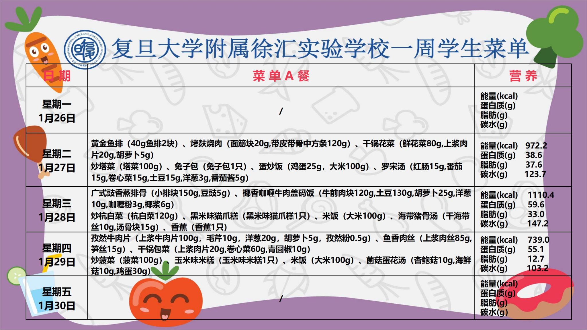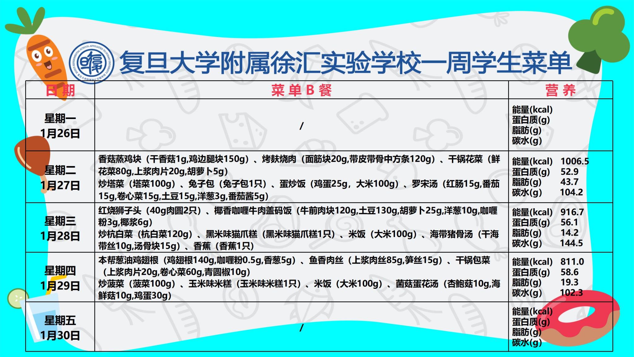 复旦大学附属徐汇实验学校学生菜单 第二十二周_小学部(2026年1月26日-2026年1月30日)