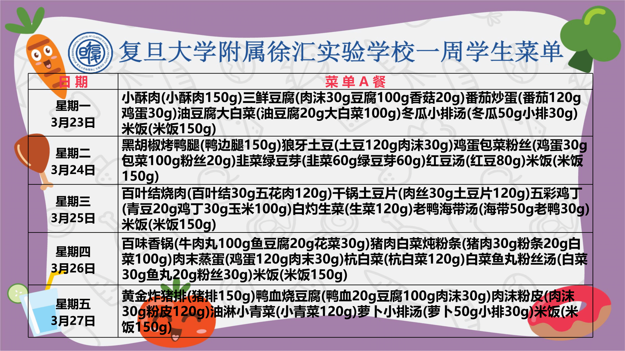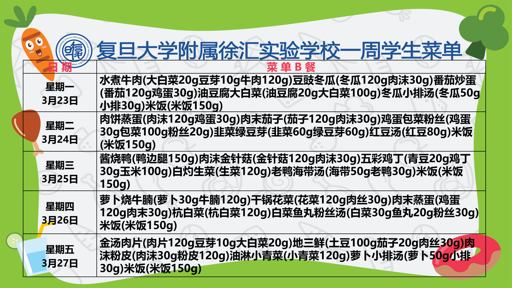 复旦大学附属徐汇实验学校学生菜单 第四周_初中部(2026年3月23日-2026年3月27日)