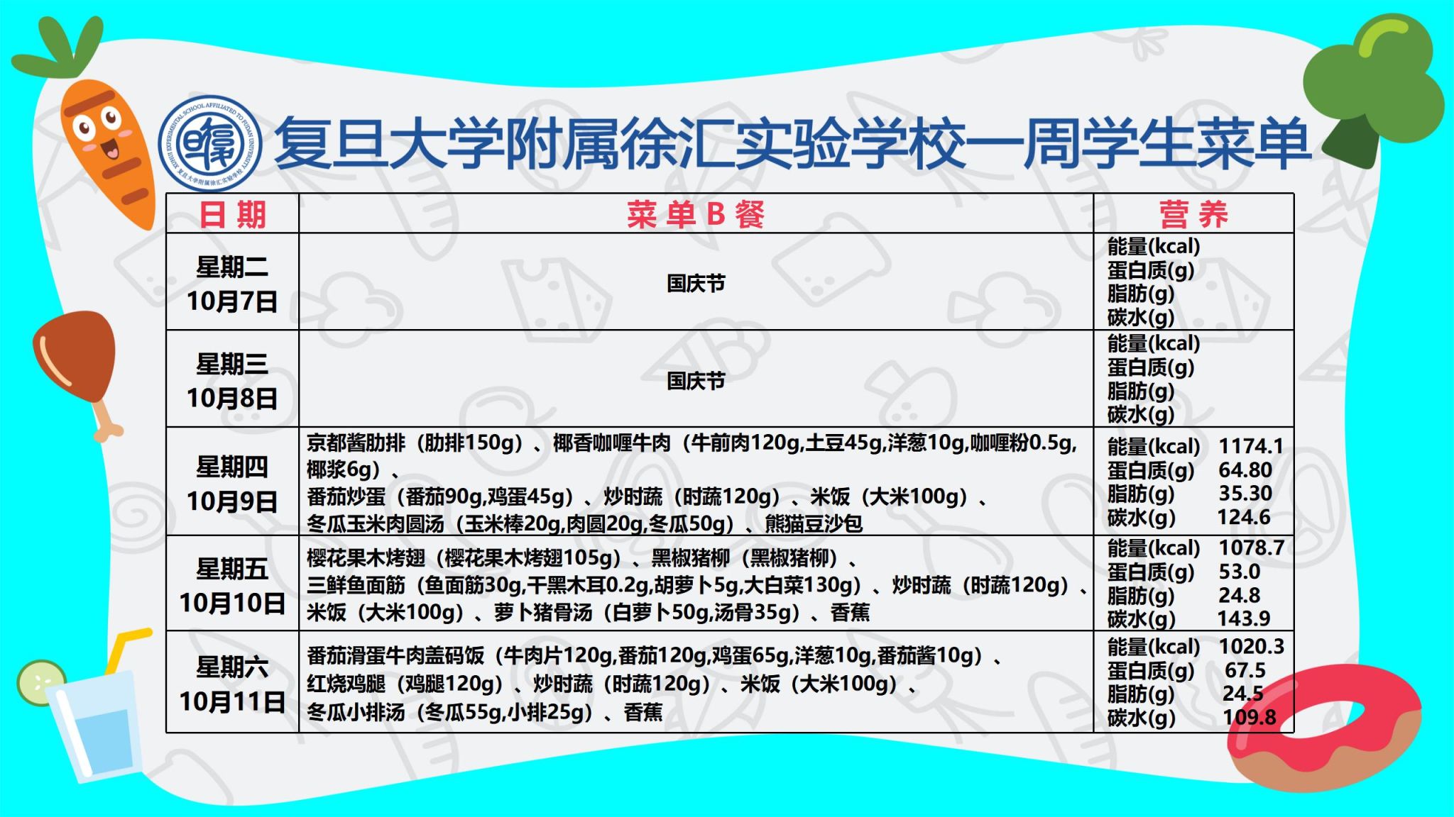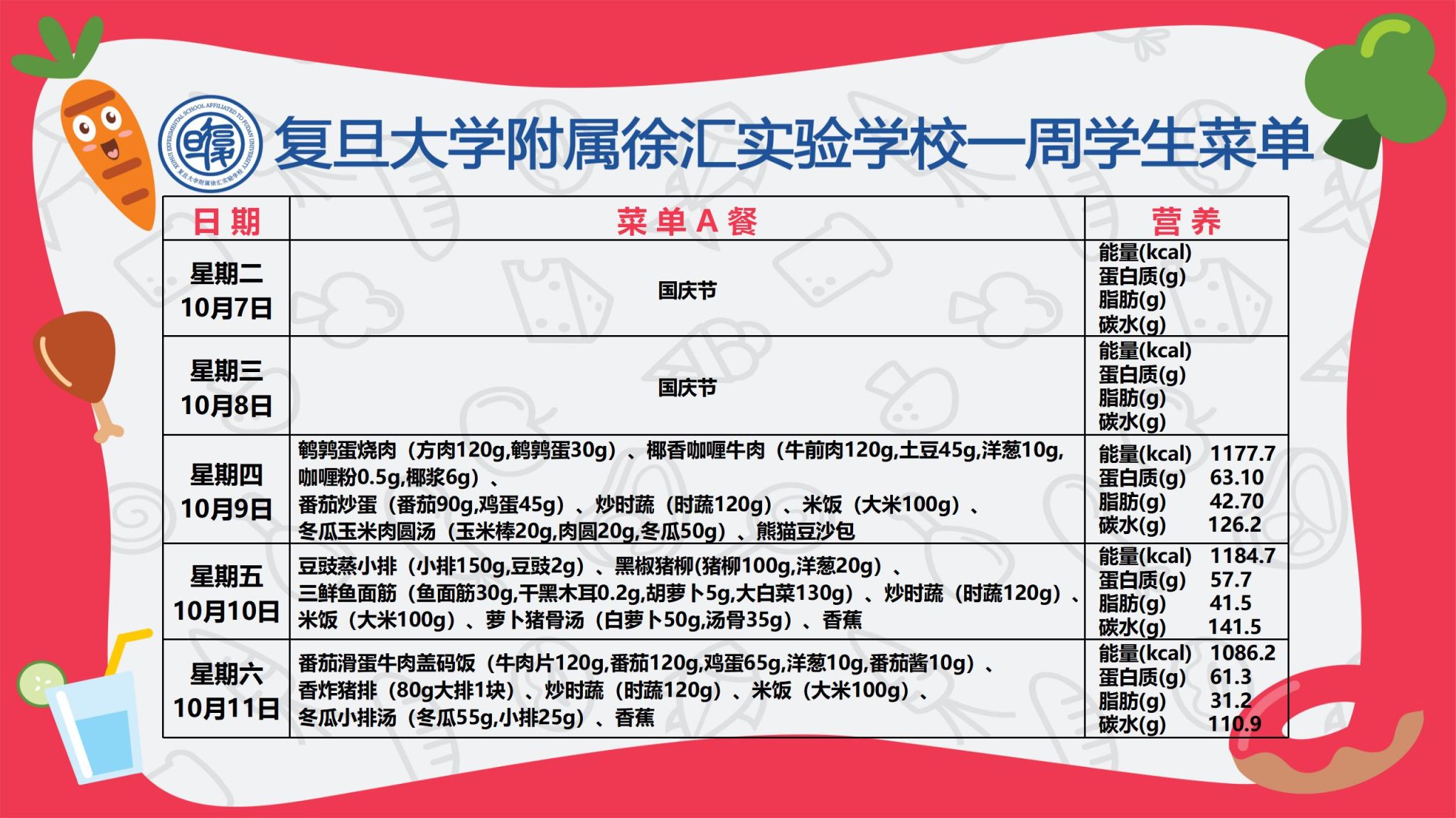 复旦大学附属徐汇实验学校学生菜单 第六周_小学部(2025年10月9日-10月11日)