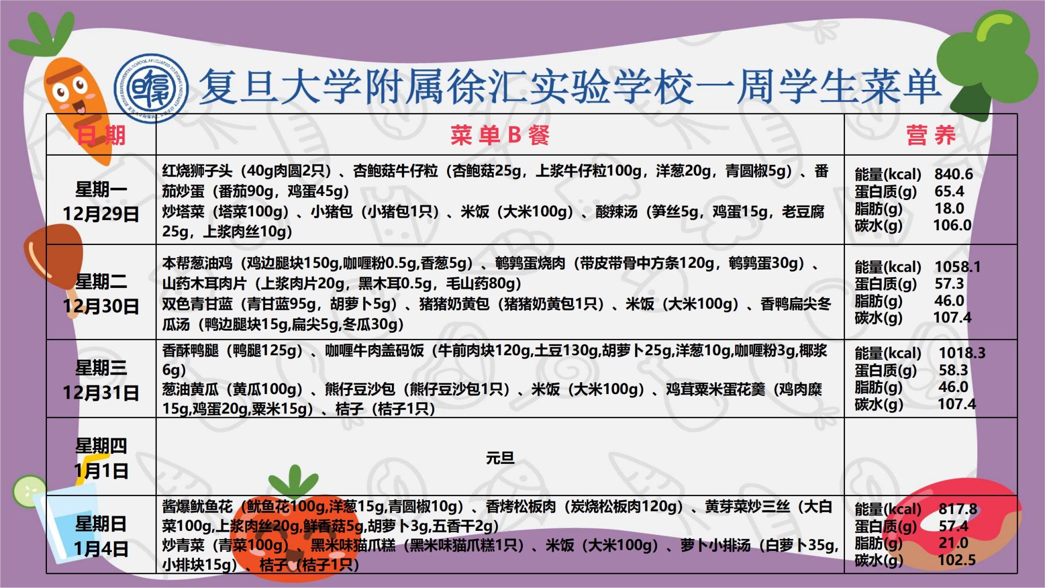 复旦大学附属徐汇实验学校学生菜单 第十八周_小学部(2025年12月29日-2026年1月4日)