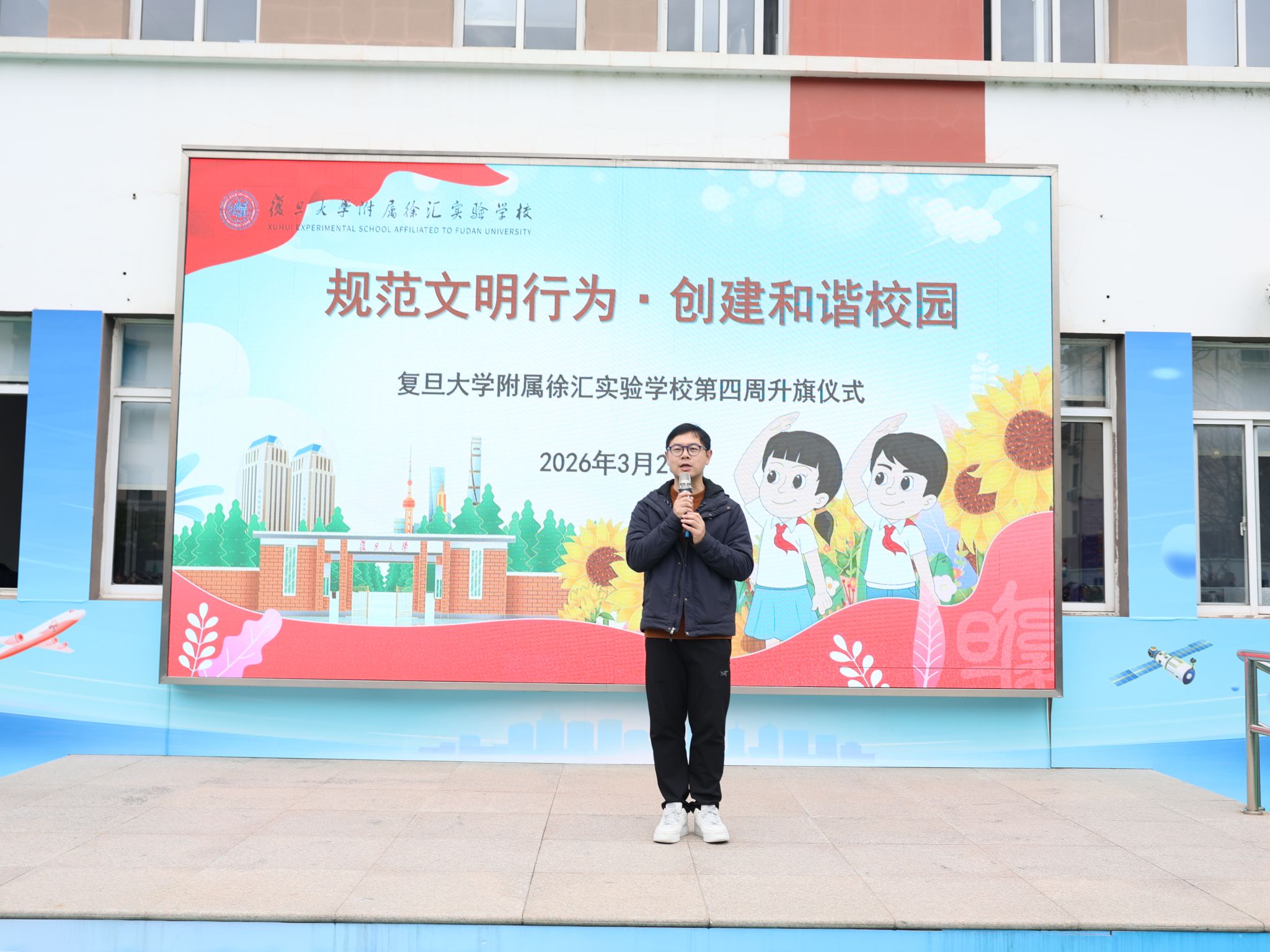 “整洁有序的校园环境、和睦融洽的人际氛围,都源自每一个小小复旦人的文明之举。”在主持人真挚的倡议与总结中,第4周升旗仪式圆满落下帷幕。让文明礼仪融入日常,用一言一行筑就文明校园,让讲文明、树新风成为全体师生共同的坚守——这不仅是仪式的结束语,更是新学期里一份庄严而温暖的行动约定。