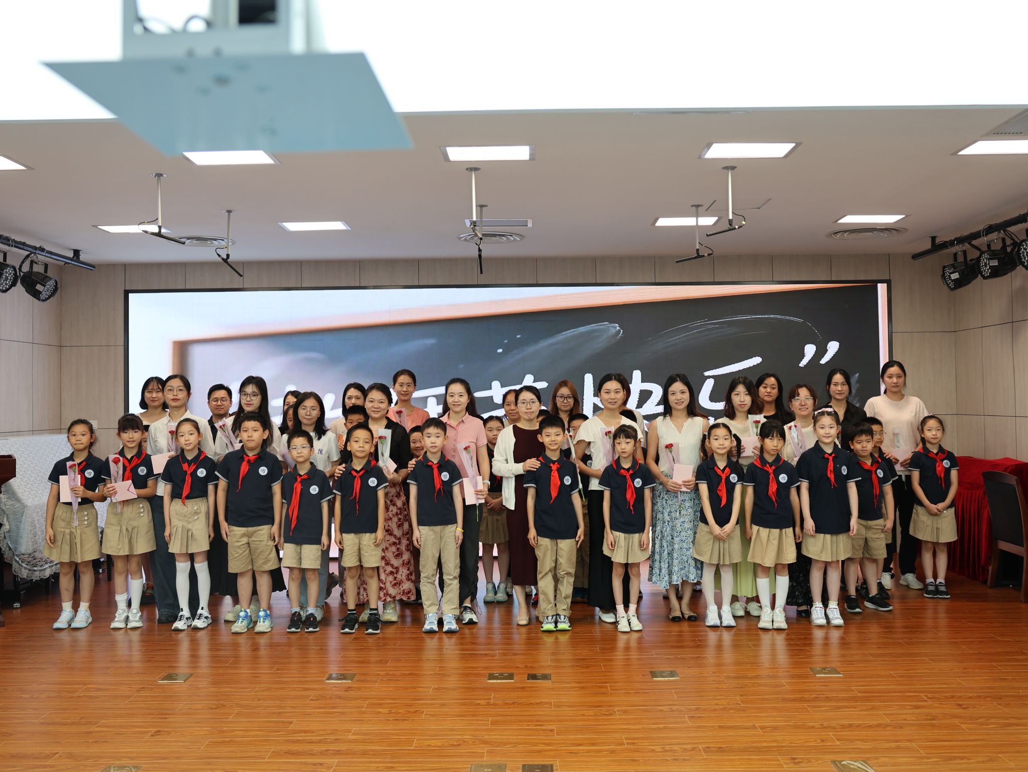 少先队员手捧百合与康乃馨献给全校教师。当老教师轻抚胸前"从教三十年"勋章接过鲜花,与新教师手中的花束交相辉映,构成"传承与接力"的动人画面。