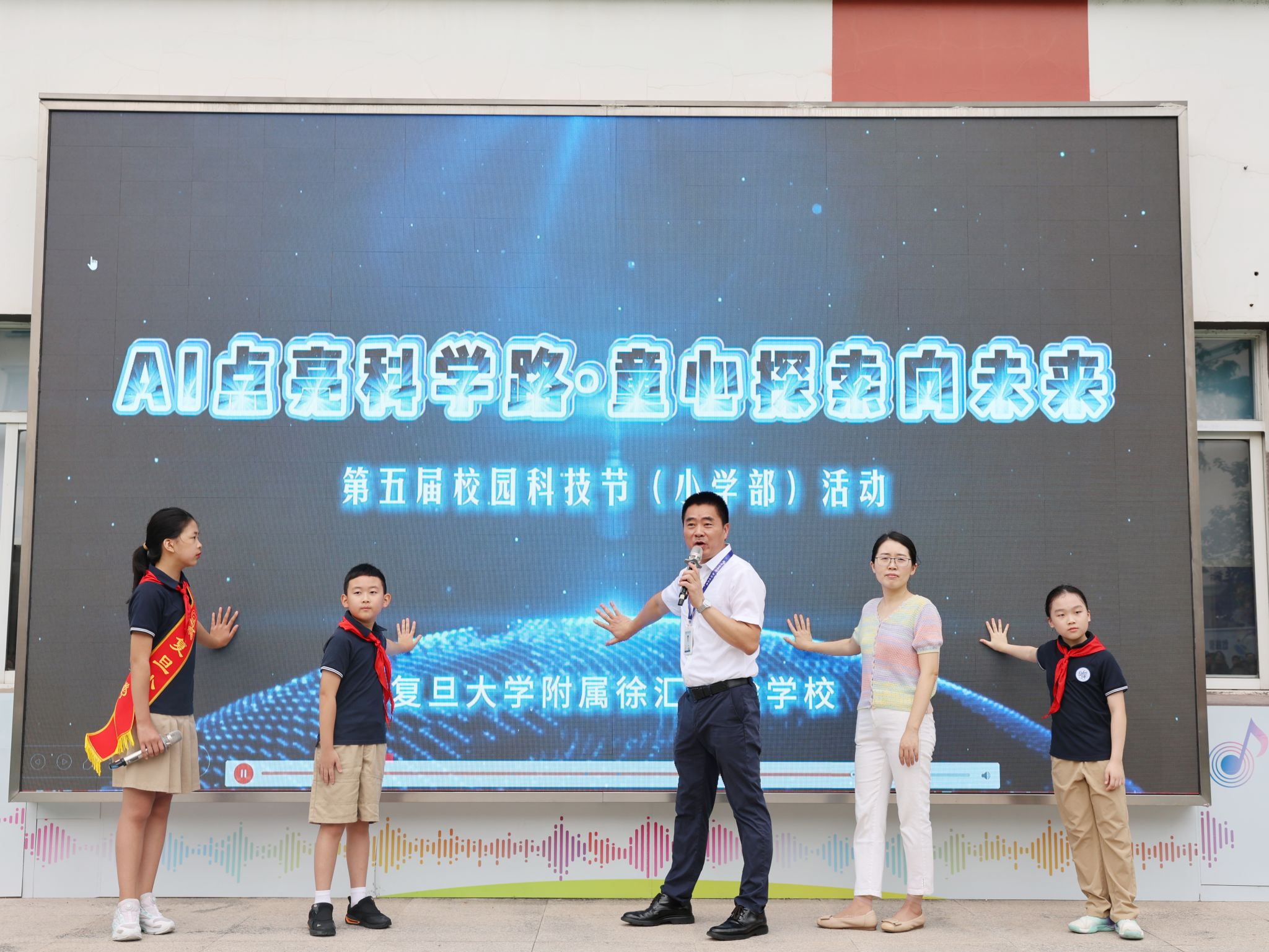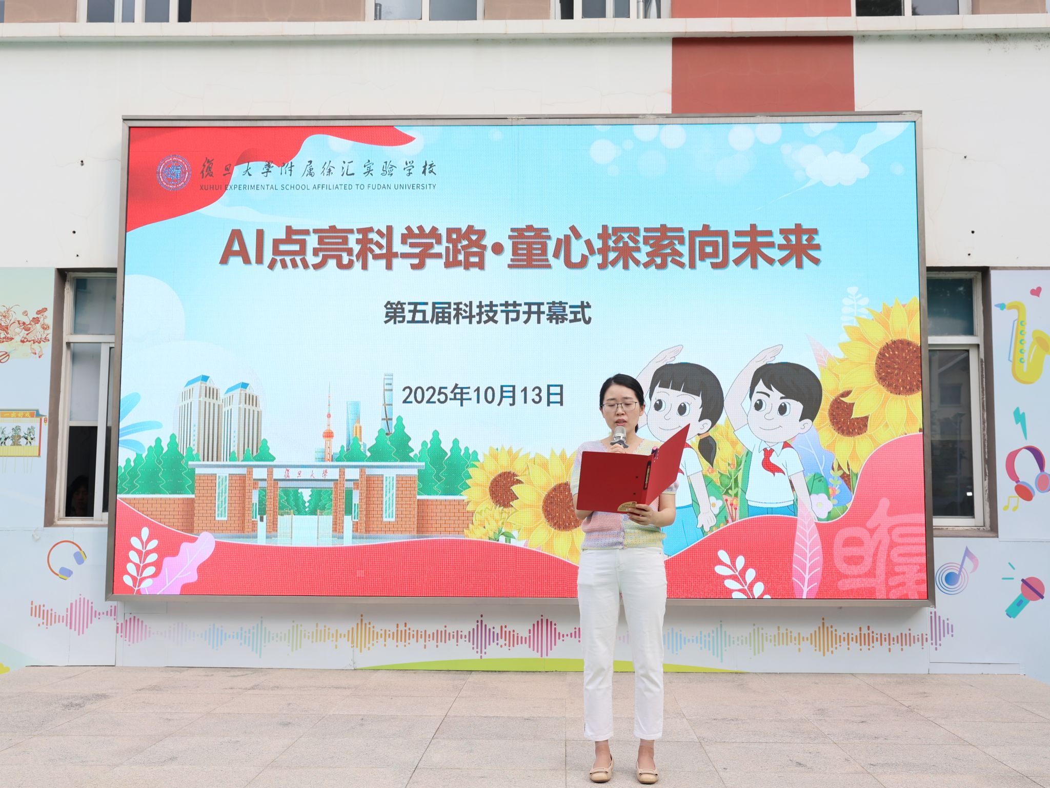 在精彩表演之后,科技总辅导姜老师登台,正式发布本届科技节主题 “AI点亮科学路·童心探索向未来” ,并详细介绍了系列活动安排