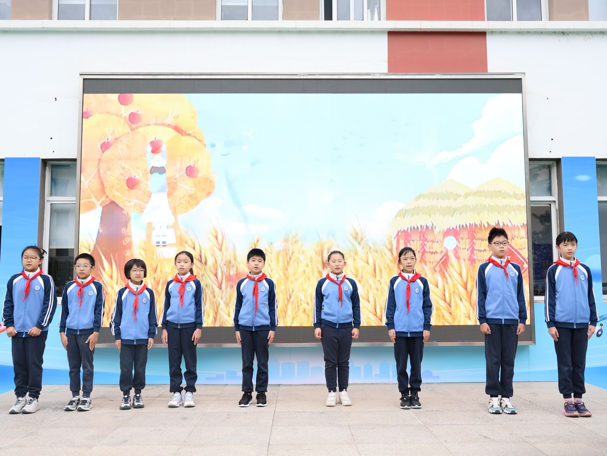 秋分时节,金风送爽。复旦大学附属徐汇实验学校全体师生齐聚校园,迎来以“传承中华文脉·争做新时代好少年”为主题的第八周升旗仪式。主持人五(4)班林恬羽同学以清亮的声音宣告仪式开始,全体师生在庄严的国歌声中向国旗行礼,校旗随之冉冉升起,蓝白旗帜与秋日晴空交相辉映,寓意传统美德与时代精神的融合。