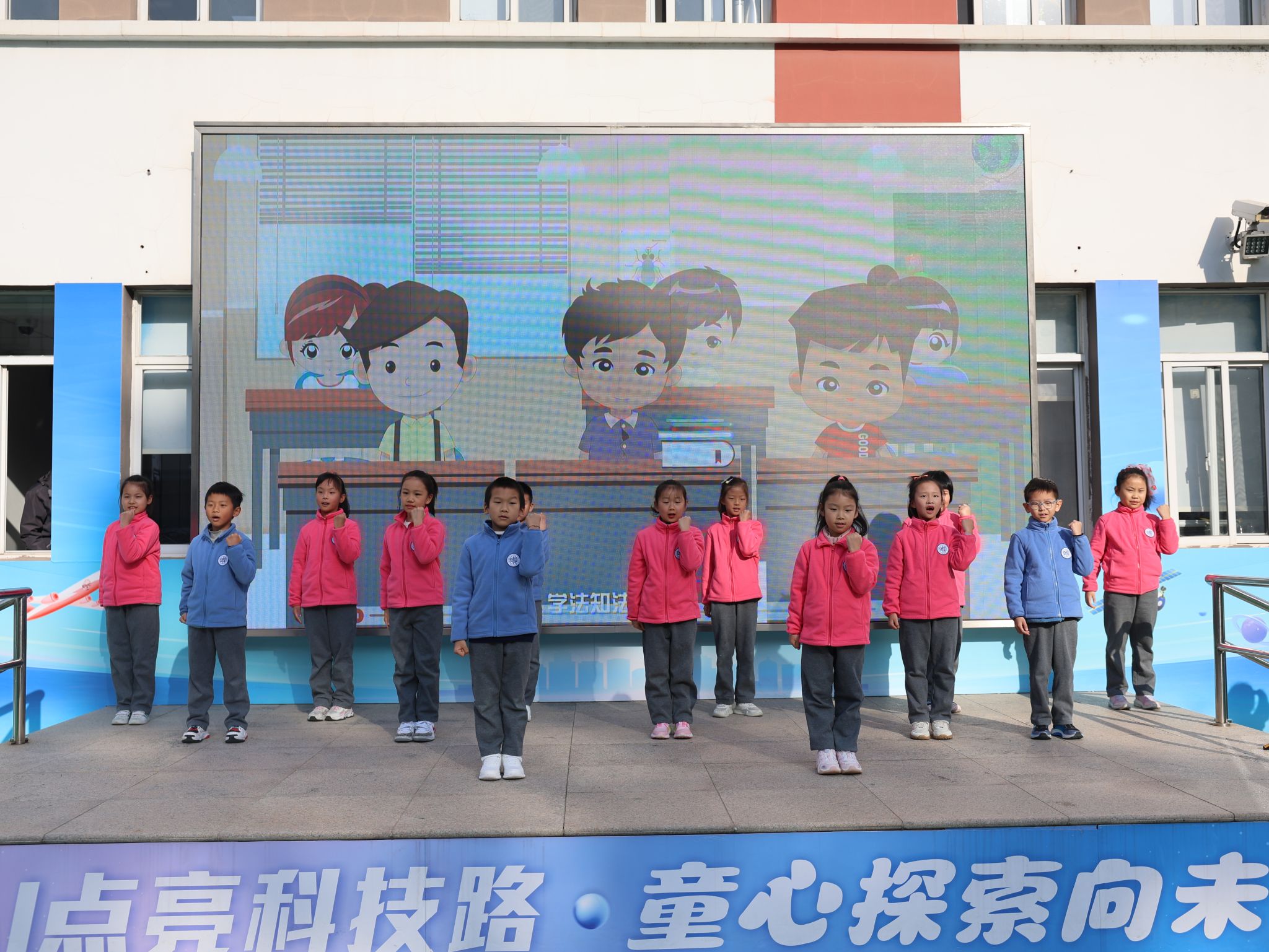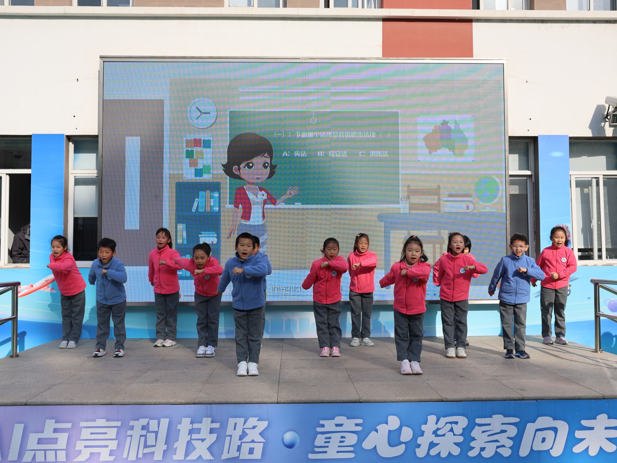 二(3)班同学表演《法治歌》手势舞,通过“红灯停绿灯行”“排队礼让”等生活化动作,将抽象法律条文转化为可感可知的行为准则。整齐划一的手势配合朗朗上口的歌词,让法治意识随律动潜入童心。