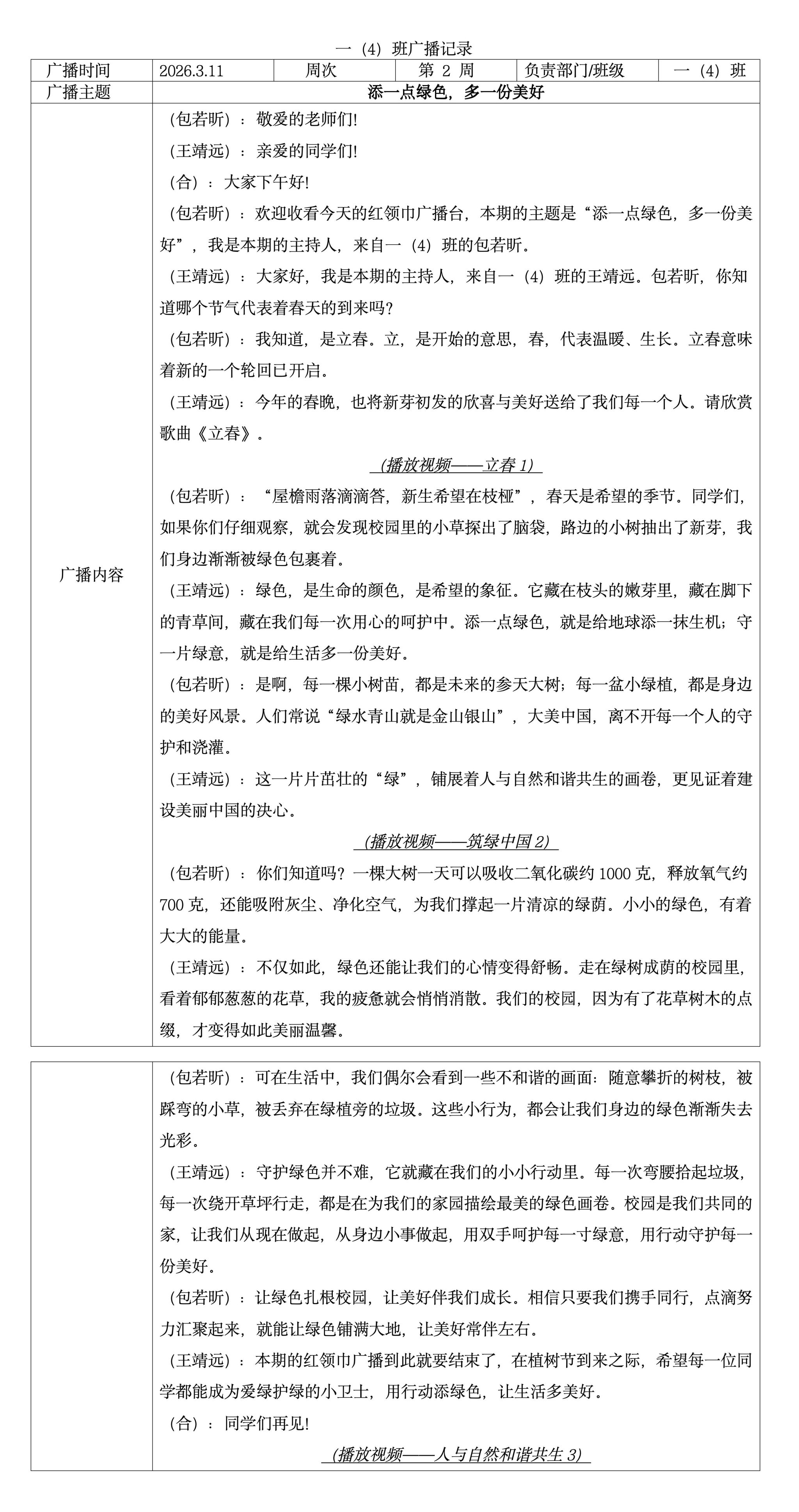 一(4)班红领巾广播:添一点绿色·多一份美好