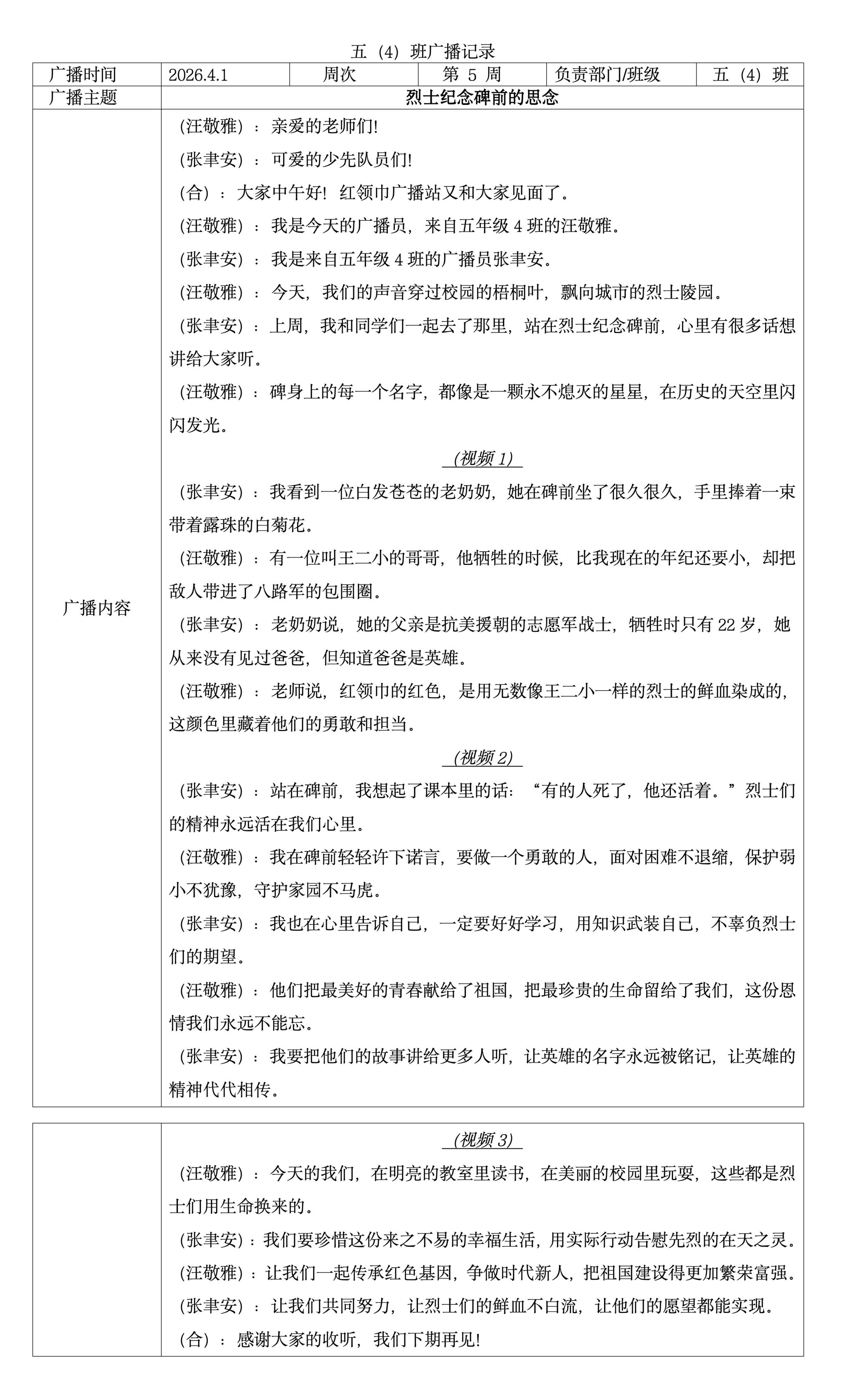五(4)班红领巾广播:烈士纪念碑前的思念