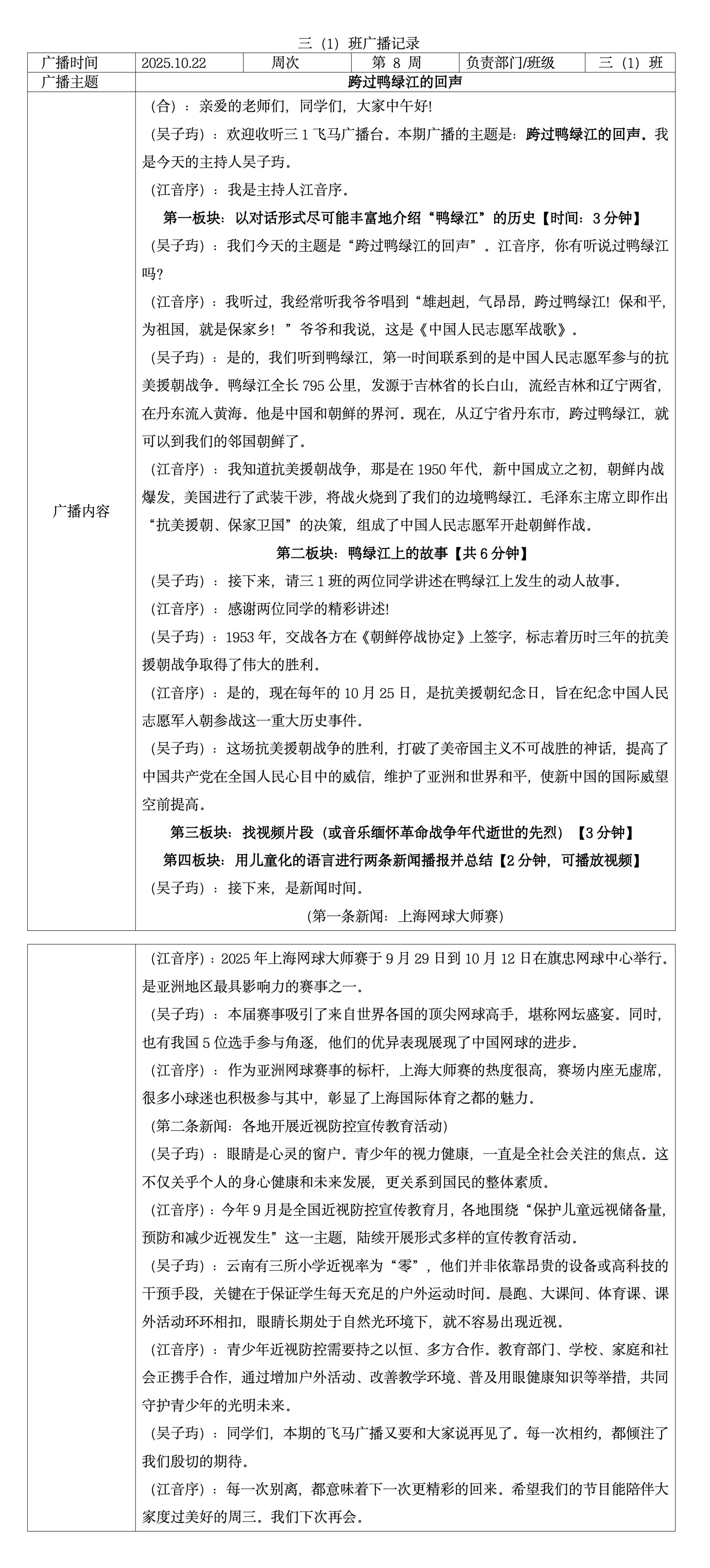 三(1)班红领巾广播:跨过鸭绿江的回声
