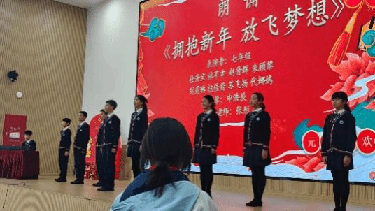 紧接着,七年级学子的朗诵《拥抱新年 放飞梦想》温情登场。6名朗诵者精神抖擞、站姿挺拔,以铿锵有力的语调、真挚饱满的情感,道出对过往一年的感恩与不舍,抒发对新年的憧憬与对梦想的执着追求。“以少年意气,赴时代之约;以满腔热忱,筑未来之路”等经典语句,既贴合“韶华正好”的主题,又展现了当代少年的责任与担当,引发全场师生强烈共鸣。