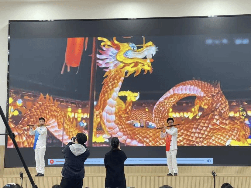 午会在校长的新年致辞中拉开序幕。校长回顾了过去一年学校的成长与收获,寄语同学们以梦想为帆、以奋斗为桨,在新的一年里向阳而生,让现场师生备受鼓舞。随后,两位男同学携笛子登场,悠扬的旋律如清泉流淌,时而轻快灵动,时而婉转悠扬,瞬间将观众带入诗意氛围。
