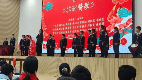 寄语过后,一场视听盛宴正式上演。六年级刘雅菲、陈梓萌、钱谦益同学带来扬琴、古筝、二胡合奏《金蛇狂舞》,同时,杨轶祺、冒思宇同学现场挥毫泼墨,用书法传递对新年的美好期许。五位同学默契配合,扬琴的清脆如珠落玉盘;古筝的悠扬似流水潺潺,三种民族乐器交织共鸣,碰撞出灵动激昂的旋律瞬间点燃全场。台下的同学们纷纷不由的坐直身体,眼睛专注地欣赏着这场乐声与笔墨的盛宴。一曲终了,同学们用热烈的掌声表达对台上两位同学精彩表演的肯定;六年级同学们带来合唱《非洲赞歌》。歌声中蕴含着最纯粹的热情与蓬勃的活力,独特的异域风情令人眼前一亮,而那份纯粹也让大家感受到了来自非洲大陆上原始且炙热的朝气。不少同学跟着歌声拍手打节拍,现场氛围热烈又充满欢声笑语。